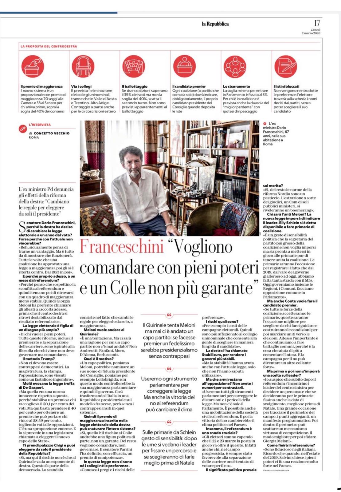 La legge elettorale è figlia "di chi vuole i pieni poteri. Tutte queste riforme, inclusi il premierato e la separazione delle carriere, sono ispirate alla filosofia che chi vince non deve governare ma comandare". A dirlo in un'intervista a la Repubblica è l'ex ministro del Partito Democratico, Dario Franceschini, secondo cui "il rischio non è che al Quirinale vada un esponente di destra. Questo fa parte della democrazia. Lo scandalo consiste nel fatto che cambi le regole per eleggerlo da solo, a maggioranza".